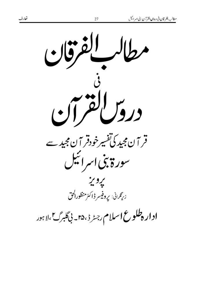 Mutalibul Furqan Fi Duroosul Quran Sura Bani Israil By Allama Ghulam Ahmed Parwez