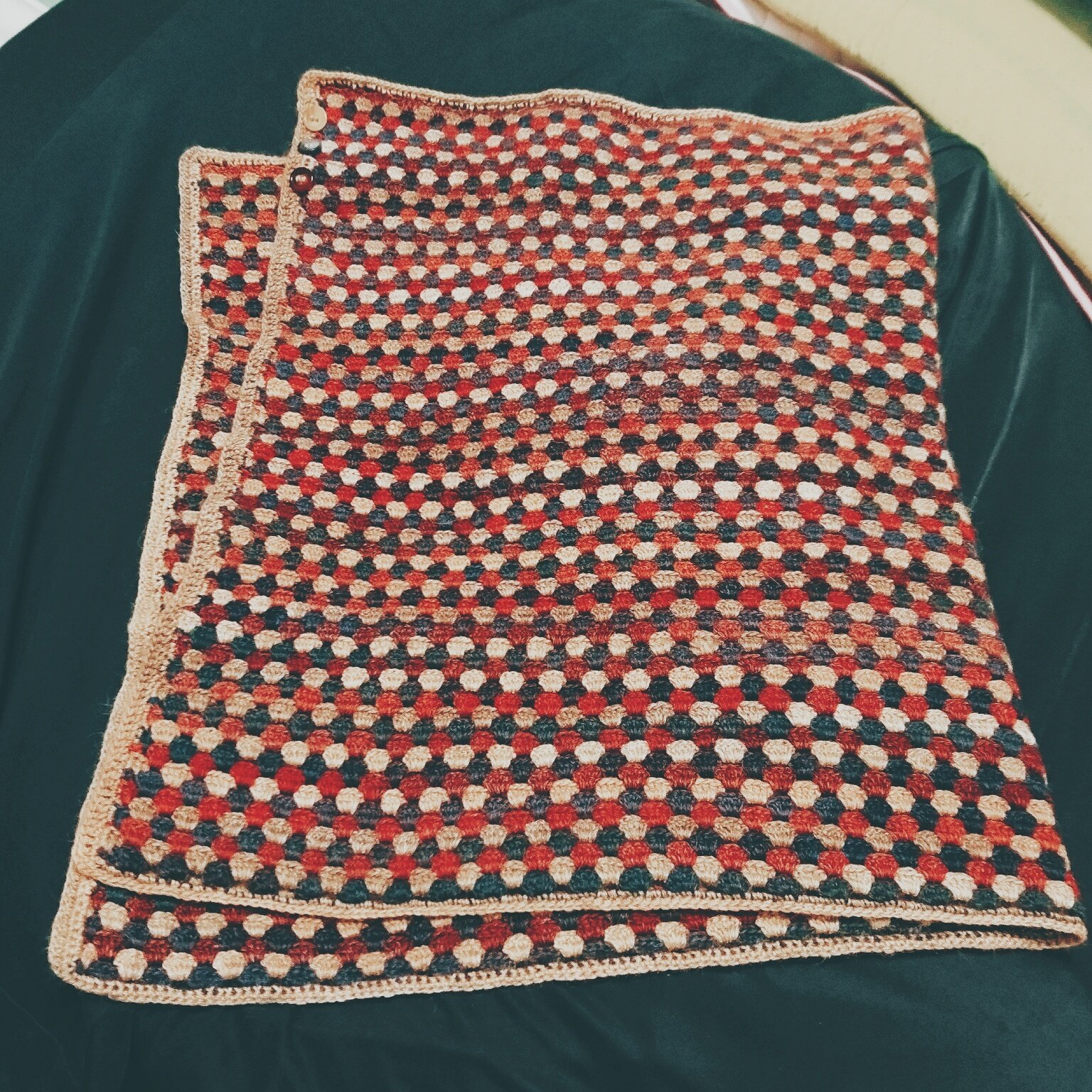 かの 羽織るとこんな感じ W و و 編み図は渡辺サトさんの ときめく手編みのブランケット を参考に 最後数段は自分で付け足し お尻まで届くから背中すっぽり 正面からは撮ってないけど円の縁を折ったところが襟みたいになるの ショール