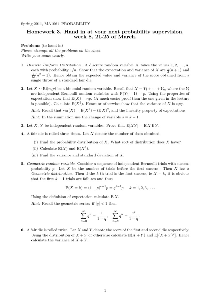 Homework 3 Hand In At Your Next Probability Supervision Week 8 21 25 Of March Expected Value Variance